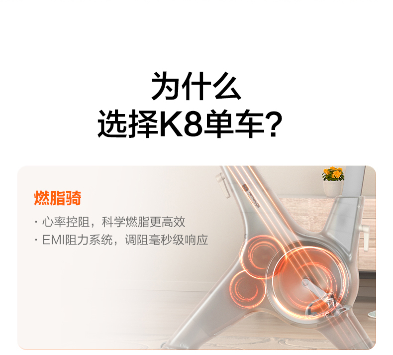 亿健K8动感单车,是集时尚、实用与健康于一体的居家运动器材。“K”型的外观设计,精巧简约又大气,超适合现代家居的装饰风格。K8单车配备了拥有发明专利的EMI智控系统,调阻精准迅速同时更加贴近真实路况的阻力变化;此外,三大骑行功能让你运动趣味再次升级,不仅可以邀请好友同享热血竞技,还能足不出户领略3D风景,尽兴骑行同时更燃脂。K8单车还配备了All-round智慧旋钮,实时反馈运动数据,帮助用户更好地掌握运动状态。选择亿健K8单车,让运动变得更加轻松愉悦,助力您迈向健康生活。