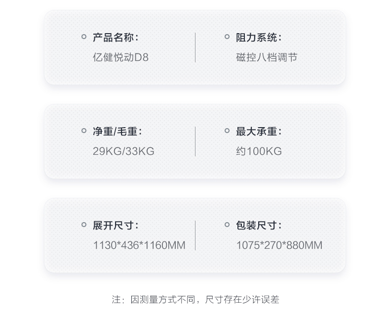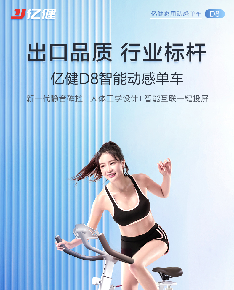 D8,时尚家居美学、运动美学、动感骑行原理,三重考量设计,给予运动健身持久的动力。磁控系统输送阻力,飞轮无接触摩擦,过程更安静。飞轮全包,安全有保障。依据人体工程学与骑行大数据设计多重把位,让骑行更多酸爽选择。8档阻力可变,乐骑燃脂兼顾,儿童老人皆可选择适合自己的档位快乐骑行。