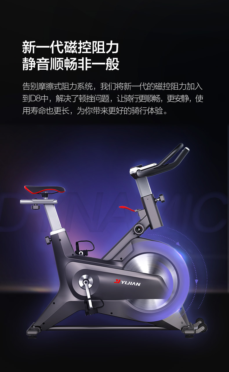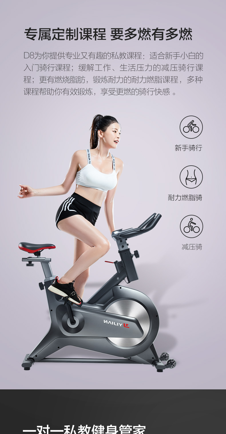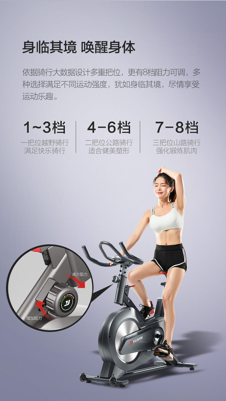 时尚家居美学、运动美学、动感骑行原理,三重考量设计,给予运动健身持久的动力。磁控系统输送阻力,飞轮无接触摩擦,过程更安静。飞轮全包,安全有保障。依据人体工程学与骑行大数据设计多重把位,让骑行更多酸爽选择。8档阻力可变,乐骑燃脂兼顾,儿童老人皆可选择适合自己的档位快乐骑行。
