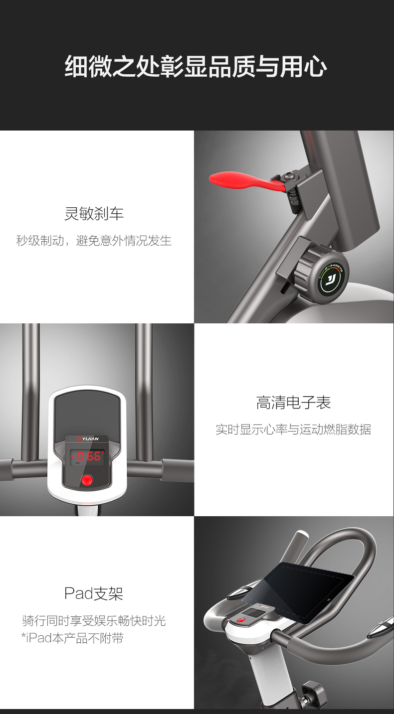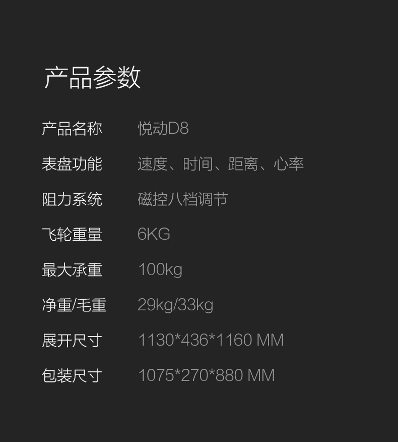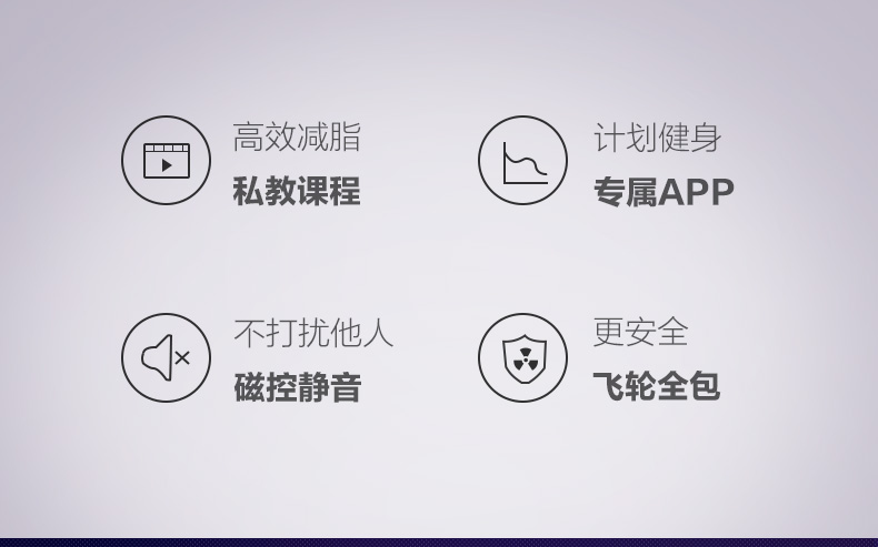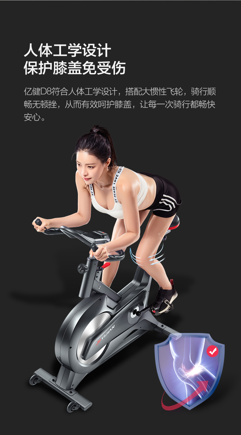 时尚家居美学、运动美学、动感骑行原理,三重考量设计,给予运动健身持久的动力。磁控系统输送阻力,飞轮无接触摩擦,过程更安静。飞轮全包,安全有保障。依据人体工程学与骑行大数据设计多重把位,让骑行更多酸爽选择。8档阻力可变,乐骑燃脂兼顾,儿童老人皆可选择适合自己的档位快乐骑行。